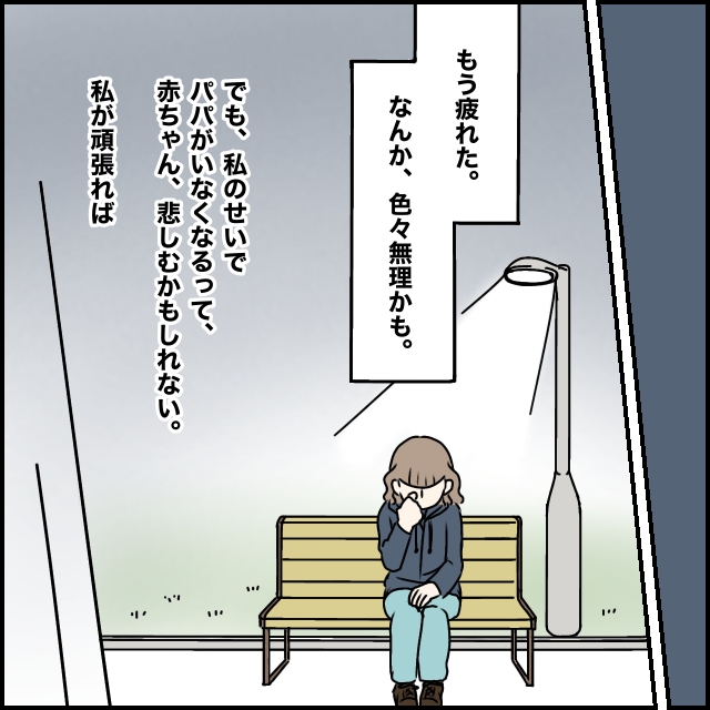 「もう疲れた。なんか、色々無理かも」家を出て公園のベンチに座った私は、タカシのことを考えていました。でも、私のせいで、パパがいなくなるって、赤ちゃん、悲しむかもしれない。私が頑張れば、