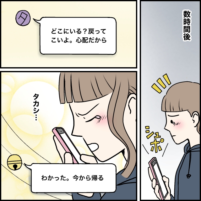 「どこにいる?戻ってこいよ。心配だから」タカシからのメールを見て「タカシ・・」と思わず涙がこみ上げた私は、「わかった。今から帰る」とメッセージを返したのでした。