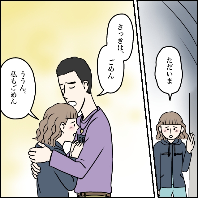 「ただいま」家に帰ると、「さっきはごめん」と謝るタカシに抱きしめられ、「ううん。私もごめん」と私も謝りました。