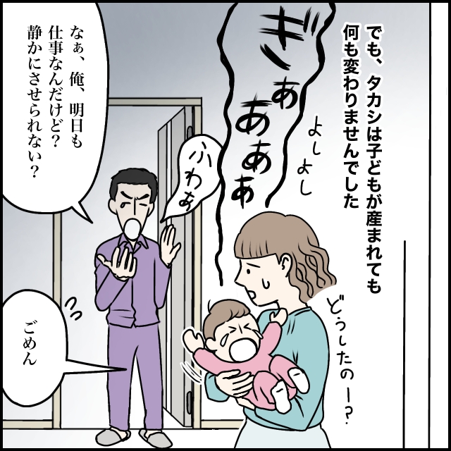 ある日泣き止まない娘をあやしていると、「なぁ、俺、明日も仕事なんだけど?静かにさせられない?」とあくびしながらタカシに言われ、私は「ごめん」と謝るも泣き止まないモモに「よしよし、どうしたのー?」と必死に声をかけました。