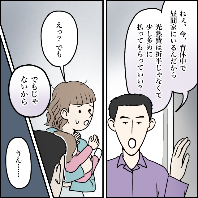 すると、「ねぇ、今育休中で昼間家にいるんだから、光熱費は折半じゃなくて少し多めに払ってもらっていい?」タカシの突然の提案にビックリ!「えっ?でも」と驚きながらそう言うと、「でもじゃないから」と冷たく言われ「うん・・」としか答えられず、光熱費を多めに払うことになってしまいました。