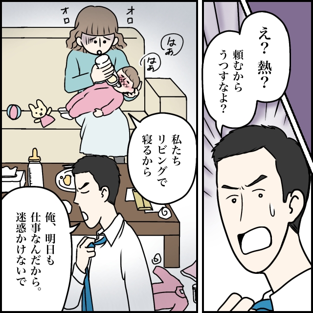 別の日、娘が熱を出してしまい、心配しながらミルクをあげていると、「え?熱?頼むからうつすなよ?」と言われ、「私たちリビングで寝るから」と答えると、「俺、明日も仕事なんだから。迷惑かけないで」とタカシ。娘の体調を心配もせず、どこまでも自分優先で怒っていました。