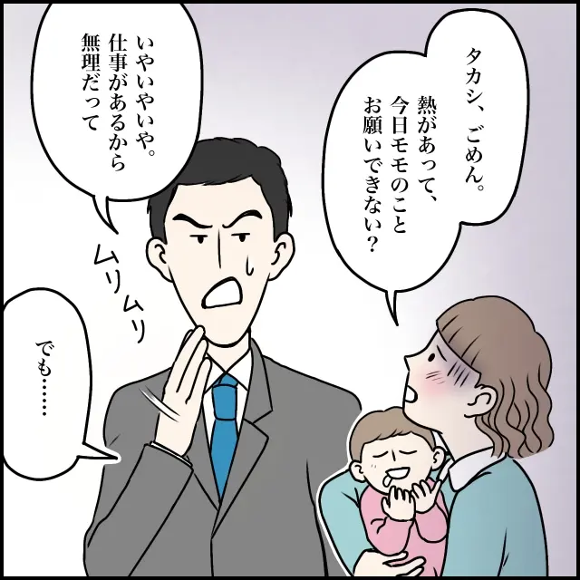 「タカシ、ごめん。熱があって、今日モモのことお願いできない?」私がすがるような気持ちでタカシに頼むと、「いやいやいや。仕事があるから無理だって」と即答するタカシに「でも・・」と諦められずに言うも、