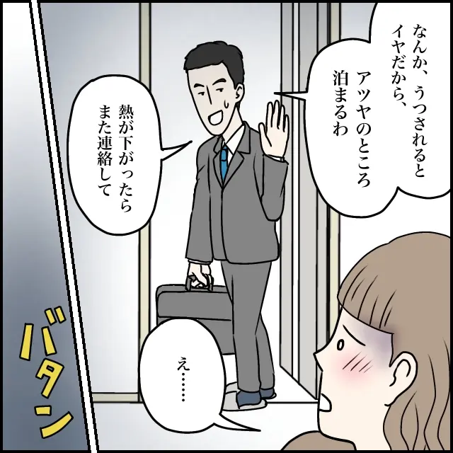 「なんか、うつされるのイヤだから、アツヤのところ泊まるわ。熱が下がったら連絡して」そう言って仕事に出かけるタカシ。「え・・」唖然として声も出ませんでした。