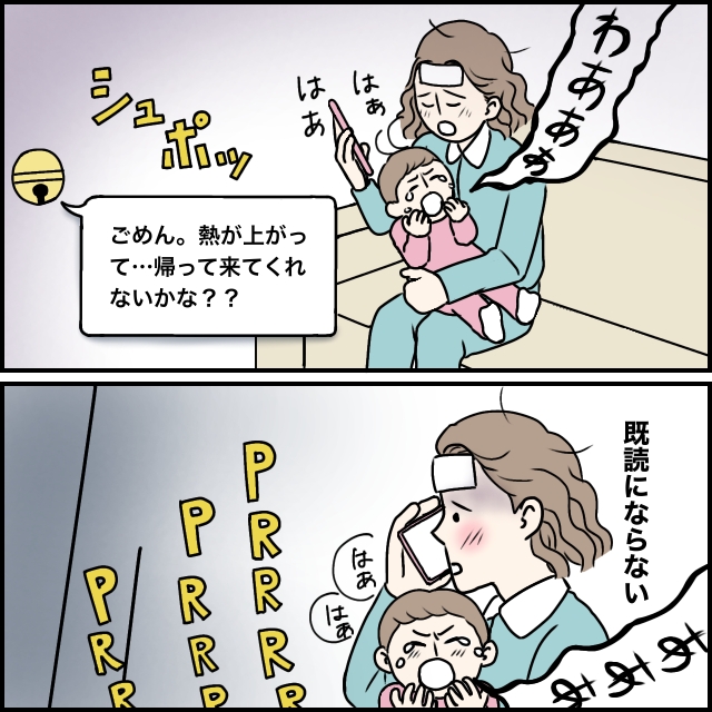 熱が下がらないなか、泣き続けるモモを抱っこして「ごめん。熱が上がって・・帰って来てくれないかな??」タカシにお願いのメッセージを送るも既読にならず・・。電話をすると、ただただコール音が鳴り響いているだけでした。