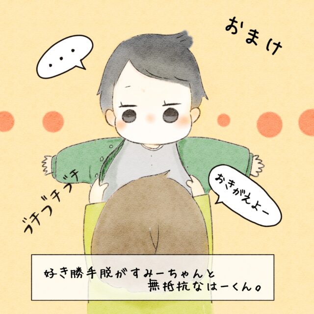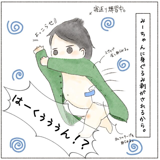 あはは!みーちゃん、お着替えさせてあげたいんですね(笑)あのスナップボタンをブチブチ外すのってちょっと気持ちいいですもんね!でも、オムツは困りますね~(笑)