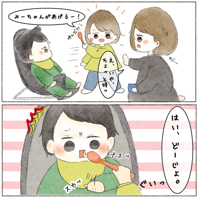 離乳食は、作るのも食べさせるのも大変ですが・・・上の子がいると別の大変さもありますね(笑)お世話好きのみーちゃん、もう少ししたらママの大きな助けになるかもしれませんね!