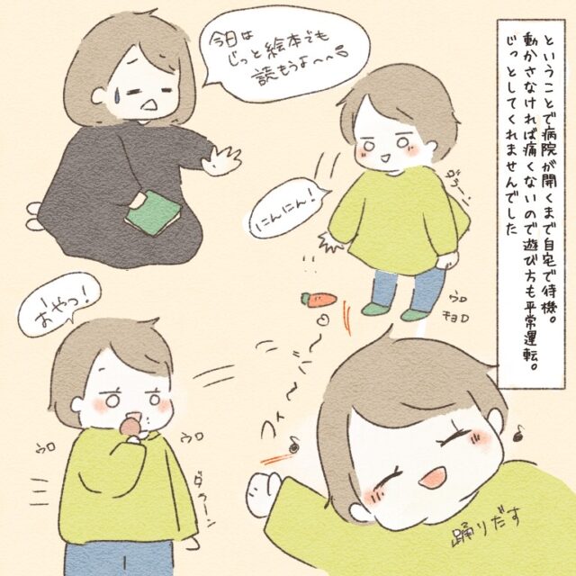 保育園で左腕が抜けてしまったみーちゃん。お昼寝タイムに激しめにゴロゴロ転がっていたら自分の体に腕が巻き込まれてしまったよう・・・。腕を動かさなければ平気そうですが、動かすとやはり痛くて泣いてしまうみーちゃん。急いでかかりつけの小児科へ連れて行くと、腕が抜けるのが初めての場合は整形外科に行った方が良いと受付で言われます。