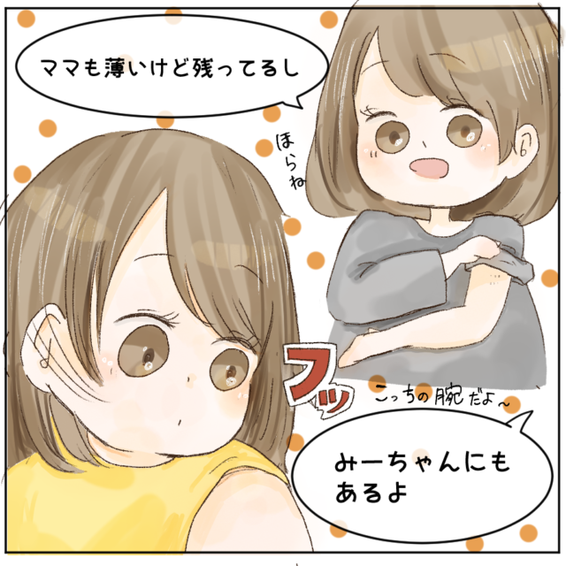 長女みーちゃん、長男はーくん、1歳7ヶ月差の年子姉弟のママである和栗ぐり(@waguri_guri)さんから、みーちゃんがびっくりしたお話です。お風呂上りにはーくんの腕を見て何かに気付いたようですよ。何があったのでしょうか?
