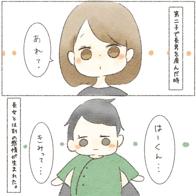 同じく第一子が女の子、第二子が男の子の母ですが・・・その気持ち、とっても分かりますー!!やはり異性だからなのか、キュンとする頻度は息子のほうが多い気がします(笑)それぞれの可愛さがありますよね!