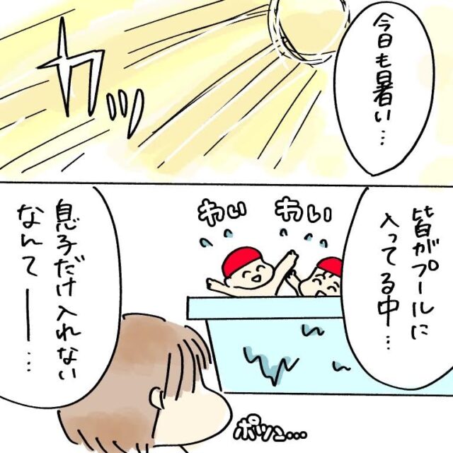天気は快晴。「今日も暑い・・・皆がプールに入ってる中、息子だけ入れないなんて」みんなが楽しくプールに入っている様子をポツンと見学する息子の姿を想像。