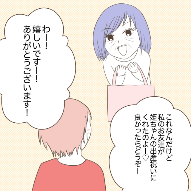 お義母さんのお友達からの出産祝い、有難いですね!プレゼントを開けるときはワクワクするものですが・・・開ける前から衝撃が!(汗)ボロボロの包装紙が意味するものとは・・・。