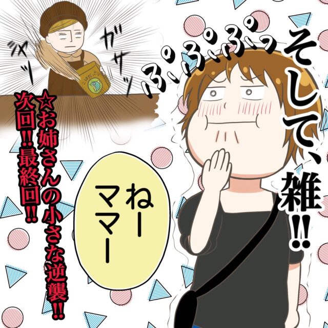 わたすさんがパンを取ろうとすると「ワシのパンだからね」と大声で牽制するマダム。わたすさんがパンを取ろうとする度に大声で文句を言ってくるためわたすさんはイライラ・・・マダムの言葉は無視してパンを選んでいたところ、突然横におじさんが現れたかと思いきや勢いよくショーケースの扉を閉められたせいで小指を挟まれ絶叫!謝らないと言い張るおじさんに「こっちが悪くなくても謝らないとネットで悪口を書かれる」から謝りなさいと言い寄るマダムは・・奥さんのようでした(汗)それを受けてイヤイヤ謝るおじさんの姿にさらに憤りを感じるわたすさんでした・・。
