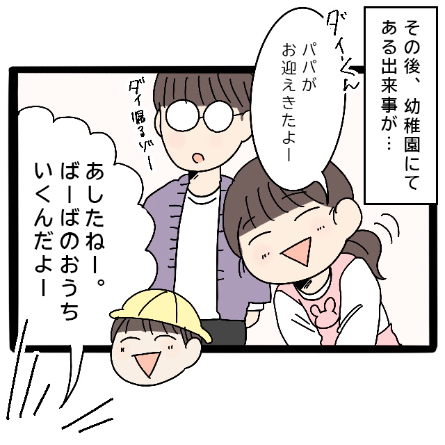 ここからは後日談。ダイが通う幼稚園である出来事が起こりました。夫がお迎え当番の日、いつも通りダイを迎えに行くと、「明日ね、ばーばのおうち行くんだよ!」と、お友達と何やら楽しそうに話す声が聞こえてきます。
