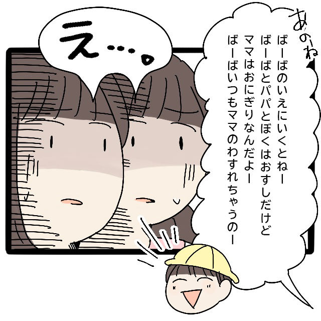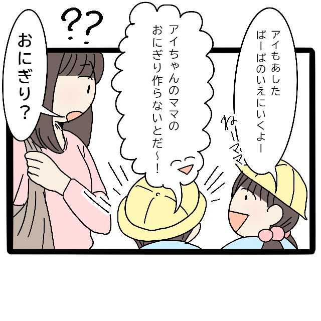 「アイも明日ばーばの家に行くよー」と話すお友達のアイちゃん。するとダイは「アイちゃんのママ、おにぎり作らないとだ~!」と言いました。アイちゃんのお母さんは不思議そうに「おにぎり?」と問いかけます。