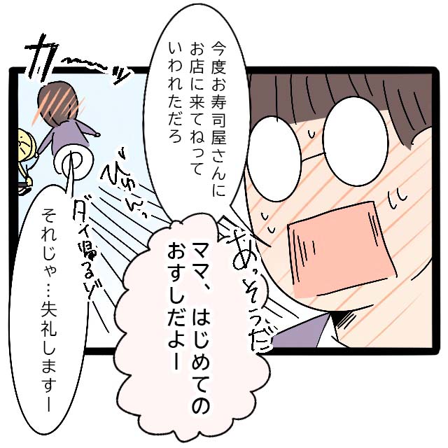 夫は顔を真っ赤にして「今度お寿司屋さんにお店に来てねって言われただろ」と言いました。そして「あっそうだ!ママはじめてのお寿司だよー」と嬉しそうに話すダイの手を取り、それじゃ失礼しますと言って、逃げるようにその場を去りました。