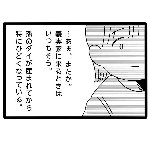 話しかけられるどころか目も合わせてもらえない、お土産を買ってきても感謝されない・・・義実家に来るといつもこう。義母は、まるで私のことが見えていないかのように振る舞います。夫と結婚してからこんな感じでしたが、ダイが産まれてからは特にひどくなりました。