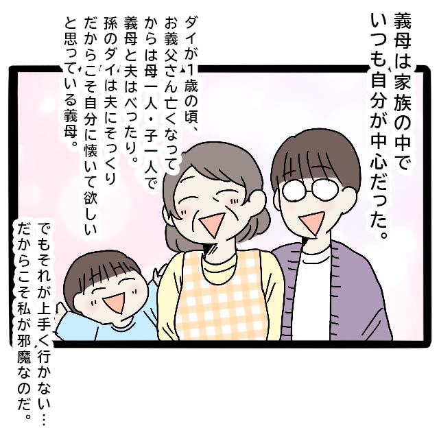 義母は家族の中でいつも自分が中心。義父と夫に世話を焼き、忙しいながらも母として充実した日々を送っていました。しかしダイが1歳の頃に義父が亡くなってからは、母1人、子1人で義母と夫はべったり。孫のダイは夫にそっくりだからこそ、自分に懐いてほしいと思っているようです。でも、ダイは母親である私が大好き。事あるごとに「ママ」と言うのが気に入らないのか、義母は私に強く当たるようになりました。