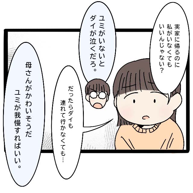 「実家に帰るのに私がいなくてもいいんじゃない?」と夫に相談すると、「ユミがいないとダイが泣くだろ」と不満そうな表情。「だったらダイも連れて行かなくても・・・」そう言うと、夫は強い口調で「母さんがかわいそうだ、ユミが我慢すればいい」と話を終わらせます。