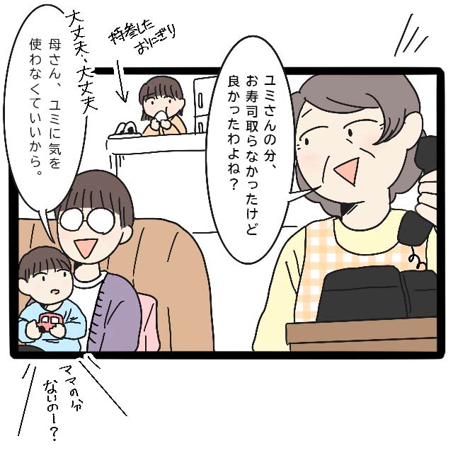 時刻はすっかりお昼時。義実家に来ると、お昼ご飯はいつも決まったお店でお寿司を取ります。だけどユミさんの分はありません。キッチンで1人、持参したおにぎりを食べていると、ユミさんが近くにいないことが嫌だったのか、ダイくんが泣き出しました。義母は「ママはあっちがいいから、ばーばと一緒に食べましょ」となだめますが、ダイくんは「ボクもママのおにぎり食べるー」と言ってユミさんの方に寄ってきます。この家でユミさんの味方をしてくれるのはこの子だけです。「食べる?持ってきたよ」とおにぎりを渡そうとすると、義母が大きな声で「ダイちゃんの大好きなおいなりさんあるよ~」とダイくんを呼び戻そうとします。後で嫌味を言われても嫌だな・・・と思ったユミさんは、ダイくんに「おいなりさん食べてきたら?」と声をかけました。すると、ダイくんはママも一緒がいいと、ユミさんの手を引き、リビングに連れて行こうとします。