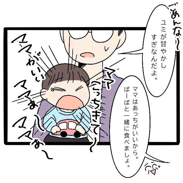 すると、私が近くにいないことが嫌だったのかダイが泣き出しました。自分に懐いていないだけなのに「ユミが甘やかしすぎなんだよ」と私のせいにする夫。義母も「ママはあっちがいいから、ばーばと一緒に食べましょ」と泣き出すダイをなだめるように声をかけます。