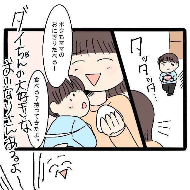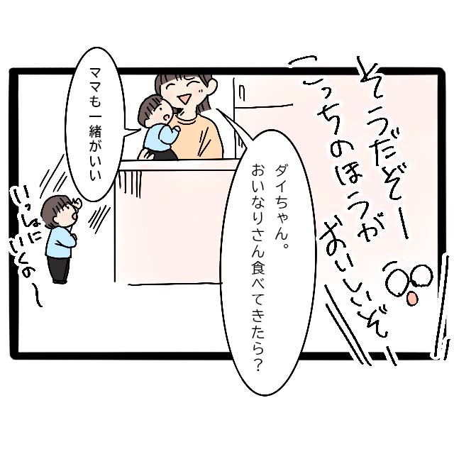 夫もダイを私に取られたくないのか「そうだぞーこっちのほうがおいしいぞー」と大きな声で呼びます。私は「ダイちゃん、おいなりさん食べてきたら?」と声をかけます。しかし、ダイは「ママも一緒がいい」と私の手を引いてリビングに連れて行きます。
