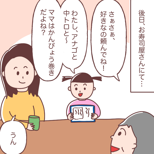 私がいつも通り「さぁさぁ、好きなのもの頼んでね!」と言うとナツミちゃんは元気よく「わたし、アナゴと中トロと~」と食べたいものを言います。