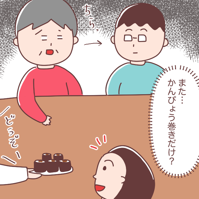 「また・・・かんぴょう巻きだけ?」と思い息子のダイキにチラリと目くばせしました。「あなたからも何とか言ってよ。」と、通じたかしら。