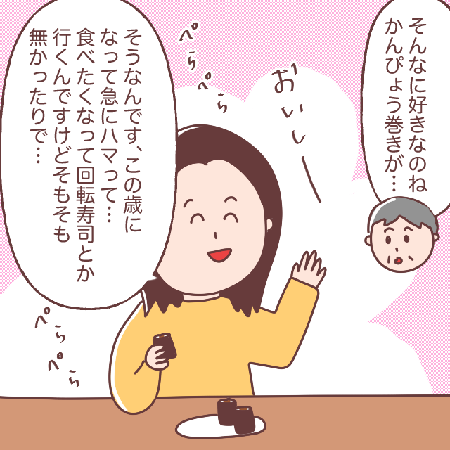 私はカスミさんの笑顔を見て「そんなに好きなのね。かんぴょう巻きが・・・」と言うとカスミさんは「そうなんです、この歳になって急にハマって・・・食べたくなって回転寿司とか行くんですけどそもそも無かったりで・・・」と熱く語り始めました。カスミさんの嬉しそうな顔に嘘や遠慮はなさそう。