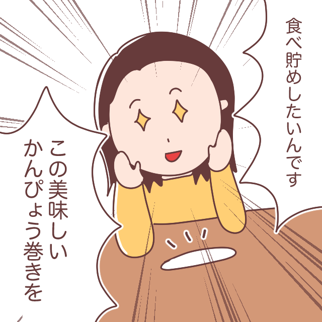 そしてすごいスピードで完食し、「食べ貯めしたいんです!この美味しいかんぴょう巻きを」と目をが輝かせました。