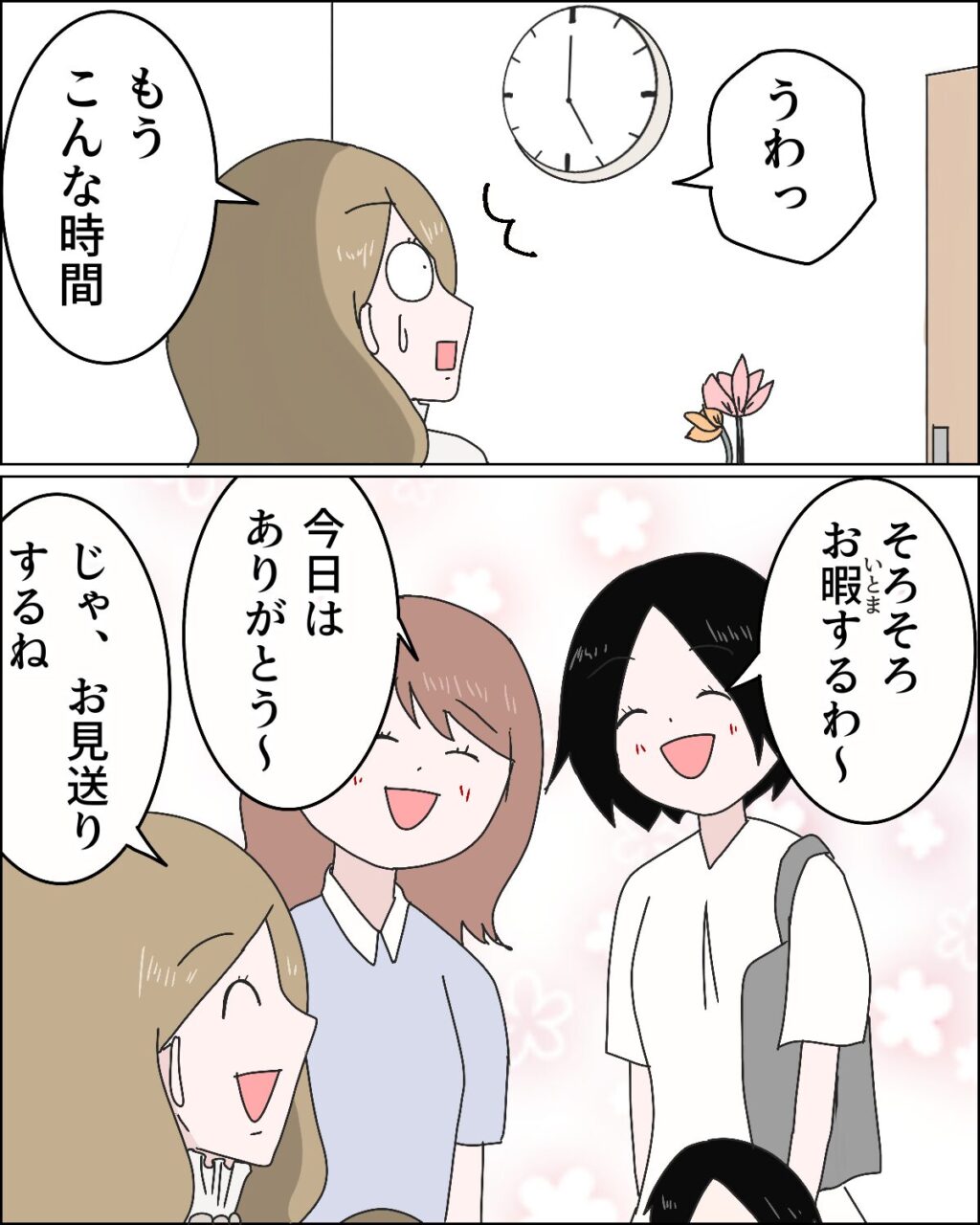 その時、ふと時計を見たアミちゃんが「うわっ!もうこんな時間」と驚きました。お友達とのおしゃべりが楽しくて時間を忘れていたようです。お友達も「そろそろお暇するわ~」「今日はありがとう~」と帰り支度を始めました。アミちゃんは「じゃ、お見送りするね」と言ってお友達と一緒に玄関を出ていきました。