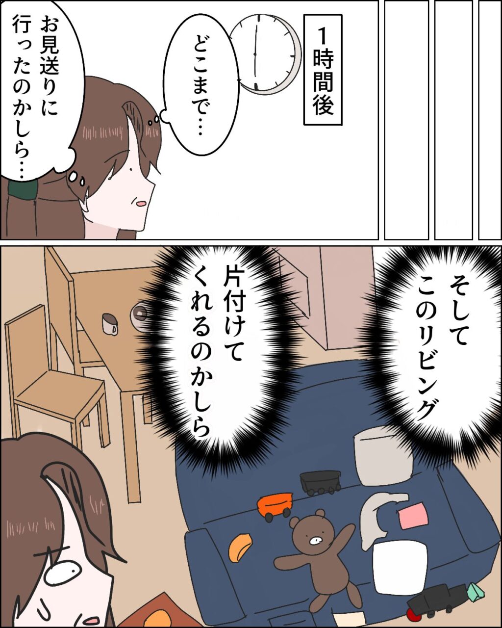 遊びに来た友達を見送ると言って1時間も帰って来ないなんて・・アミさんは一体どこまで見送りに行ったのでしょうか。ヨシコさんが散らかった部屋では落ち着かないと分かっているのなら早く帰ってきて片付けてほしいものです。