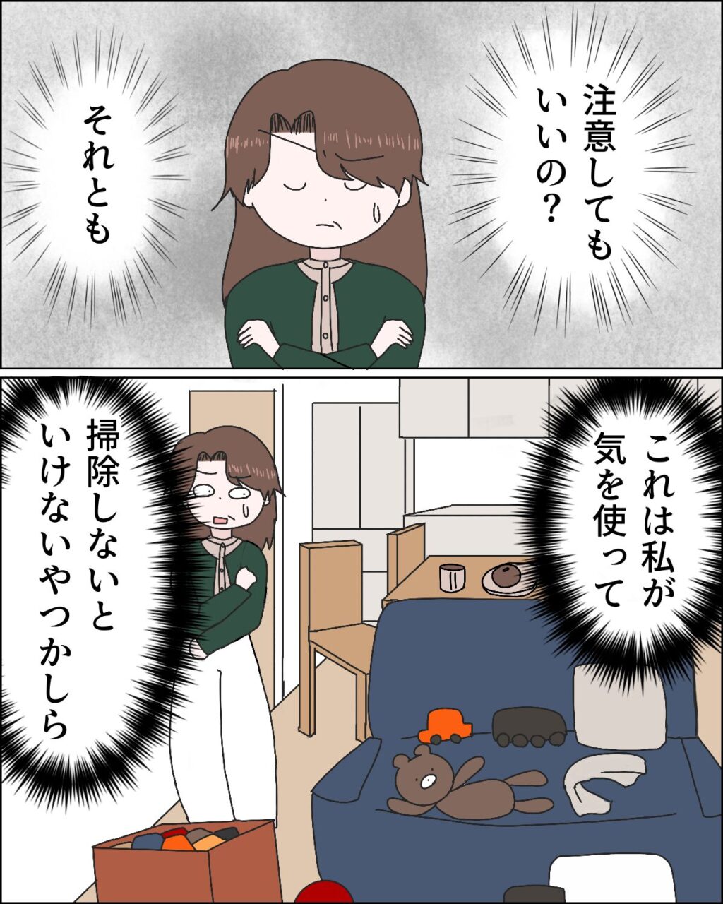 リビングは共用スペースなのだから散らかしたら早めに片付けてほしいのが正直なところ・・。注意してもいいの?それとも・・これは私が気を遣って掃除しないといけないやつかしら?派手に散らかったリビングを眺めながら私は考え込んでしまいました。