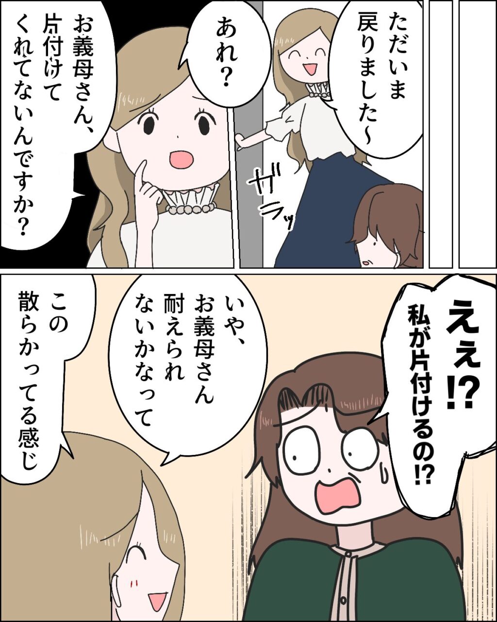 しばらくすると「ただいま戻りました~」とアミちゃんが笑顔で帰ってきました。しかし、リビングに入るや否やアミちゃんの顔から笑顔が消え、「あれ?お義母さん、片付けてくれてないんですか?」と一言。「えぇ!?私が片付けるの!?」と驚く私に、アミちゃんは「いや、お義母さん耐えられないかなって。この散らかってる感じ」とさらり。アミちゃん・・そう思うのならすぐに片付けてくれれば・・と思いつつも、口には出せない私でした。