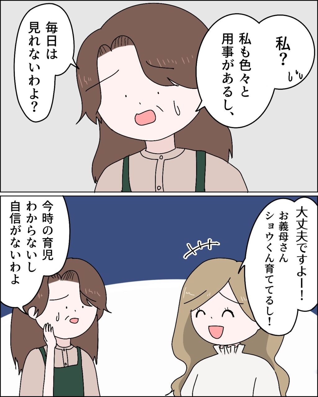 突然、息子ショウのお嫁さんアミちゃんに同居を提案されて動揺した私。ダメと言う決定的な理由はないけれど、急に言われて困ってしまいました。アミちゃんの話ぶりだと、掃除と育児を全面的に私に放り投げるように聞こえます。午前中は投資や株をしたいと言うアミちゃんは、孫のコウくんは完全に私に任せると言うので、「私も色々と用事があるし、毎日は見れないわよ?」「今どきの育児分からないし、自信がないわよ」などと不安要素を並べてみましたが、アミちゃんはケロリと笑って「大丈夫ですよ!お義母さんショウくん育ててるし!」と言いました。そういう問題じゃないのよ。
