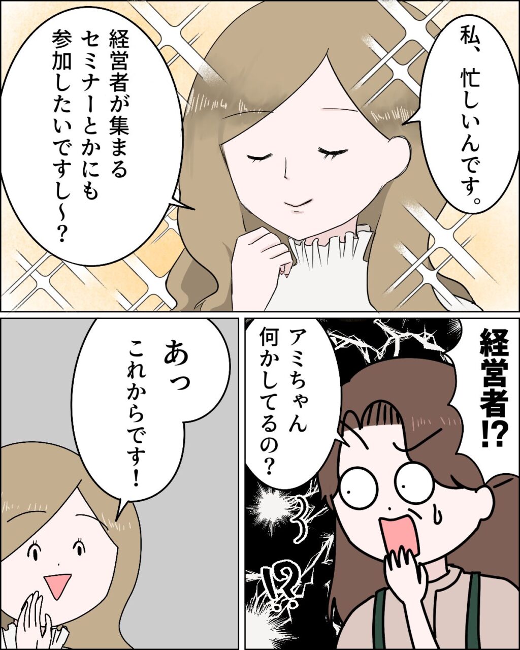 アミちゃんは「私、忙しいんです。」と自慢げに言いました。「経営者が集まるセミナーとかにも参加したいですし~?」と言うので「経営者!?アミちゃん何かしてるの?」と叫んでしまいました。コウくんが生まれて専業主婦をしているとショウから聞いていたアミちゃんがいつの間に起業したのかしらと驚いたのです。ショウから何も聞いてないわよ?するとアミちゃんは「あっこれからです」とサラリ。