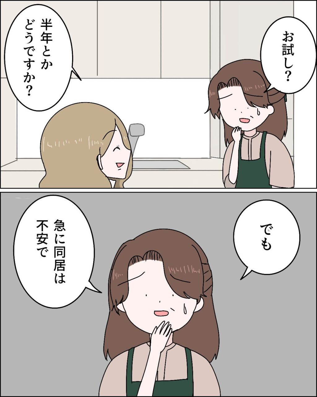 お嫁さんのアミちゃんに、家族3人でうちに引越してきても良いかと聞かれ困惑する私。やんわり断ろうとしても自分都合の良いことばかりいって引きません。とうとうお試しを提案されました。「半年とか、どうですか?」と聞かれて「でも、急に同居は不安で」と正直にこたえました。