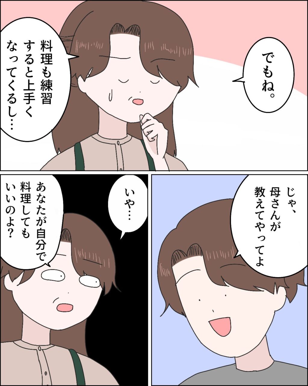 「でもね。料理も練習すると上手くなってくるし」と言うと、「じゃ、母さんが教えてやってよ」と当然のように言うショウに「いや、あなたが自分で料理してもいいのよ?」と伝えました。