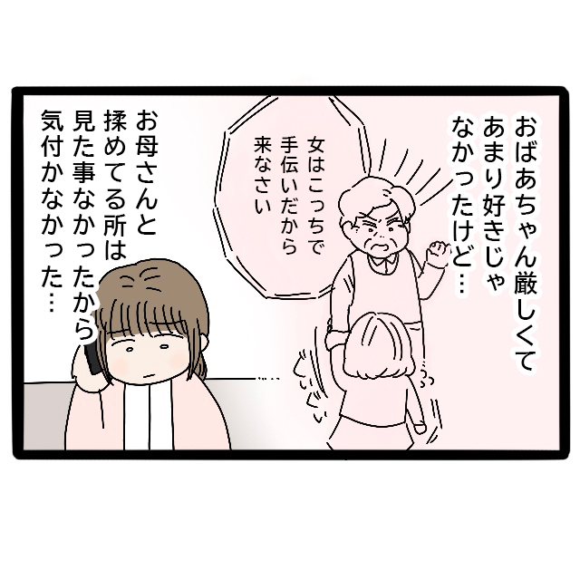 思い出を振り返るカオリさんは、「おばあちゃんは厳しくてあまり好きじゃなかったけど・・お母さんと揉めてる所は見たことなかったから気づかなかった・・」と思いました。