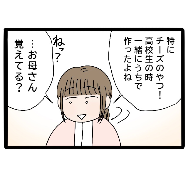 「特にチーズのやつ!高校生の時一緒にうちで作ったよね」そう言いながらカオリさんが「ねっ?・・・お母さん覚えてる?」とお母さんに話を振りました。