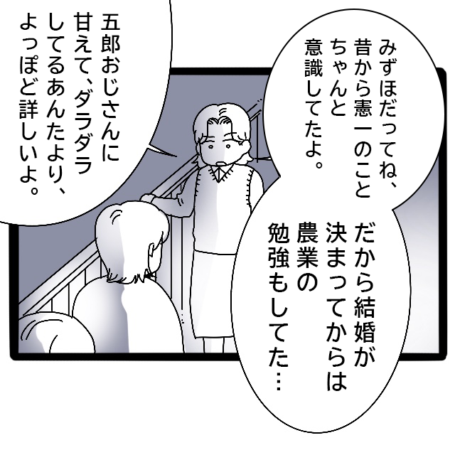 よっちゃんによると、みずほさんの方も昔から憲一さんの事をちゃんと意識していたのだそうです。実家の農業を継ぐ憲一さんとの結婚が決まってからは農業の勉強もしていました。父親に甘えてダラダラしている憲一さんよりもよっぱど農業に詳しいとピシャリと憲一さんに伝えました。