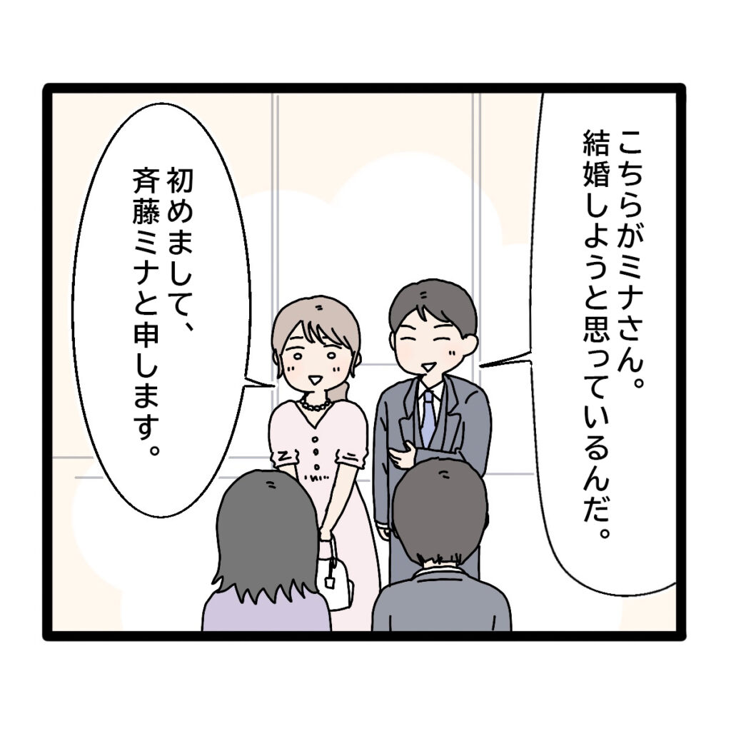 「こちらがミナさん。結婚しようと思っているんだ」伸介がそう言った後、「初めまして、斉藤ミナと申します」と挨拶しました。