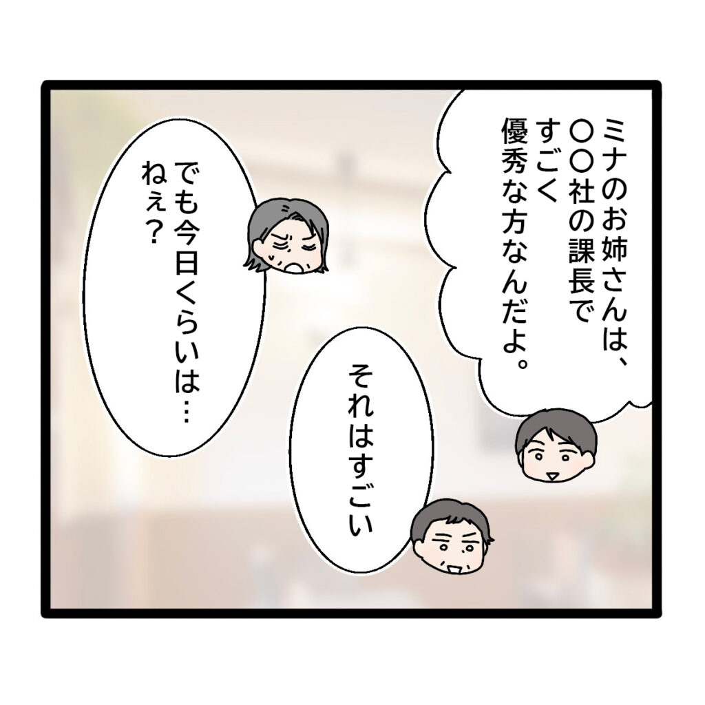 「ミナのお姉さんは、〇〇社の課長で、すごく優秀な方なんだよ」伸介の言葉に、「それはすごい」と声をあげるお父さん。「でも今日くらいは・・ねぇ?」と姉が来られないことが気に入らないのか文句ばかり。