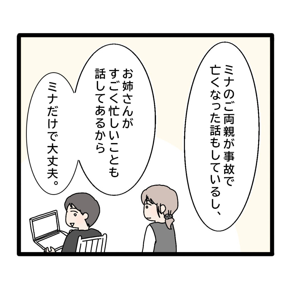 「ミナのご両親が事故で亡くなった話もしているし、お姉さんがんすごく忙しいことも話してあるからミナだけで大丈夫」伸介が優しくそう言ったものの、