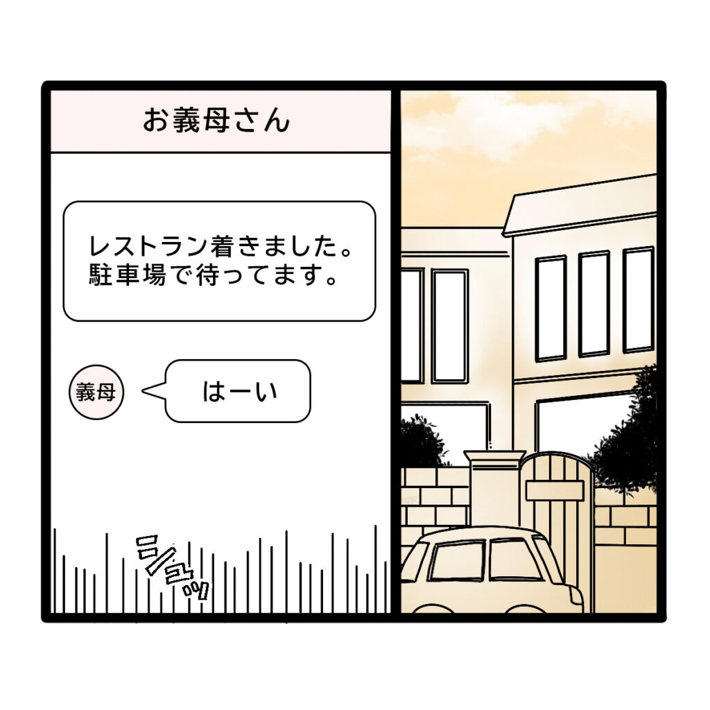そして、義母を降ろした建物の駐車場に着くと「レストラン着きました。駐車場で待ってます」と連絡を入れました。すると、すぐに「はーい」と義母から返事が。