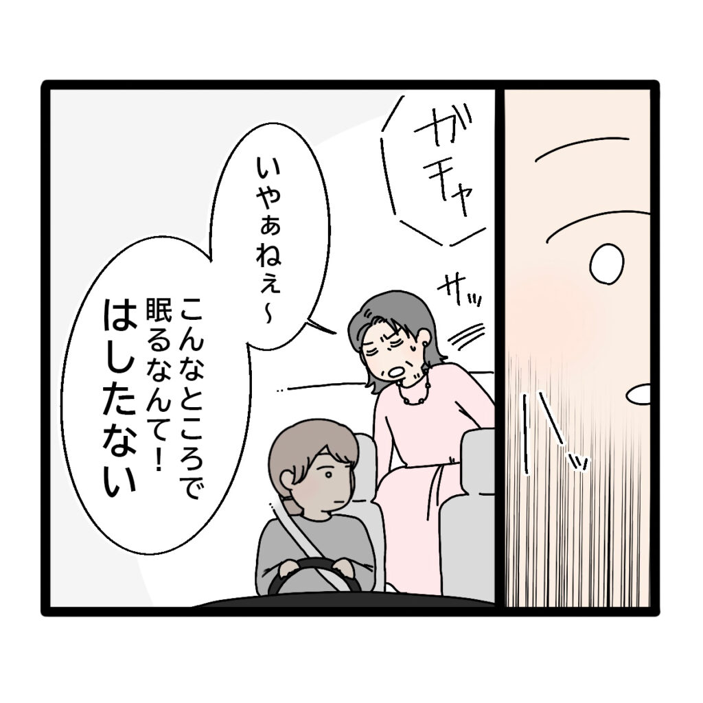 ハッと目が覚めロックを解除すると「いやぁねぇ~こんなところで眠るなんて!はしたない」と言いながら後部座席に座りました。