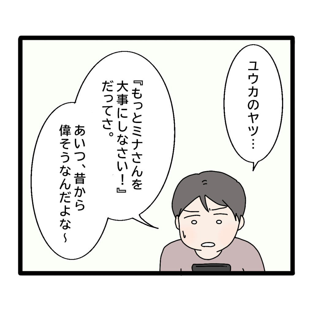 「ユウカヤツ・・『もっとミナさんを大事にしなさい!』だってさ。あいつ、昔から偉そうなんだよな~」と文句を言う伸介。