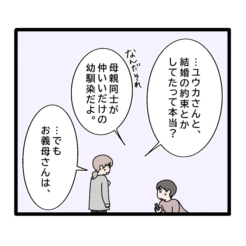 夕飯を諦めて部屋に戻った途端、「今日ユウカになんか告げ口した?」と聞く伸介さん。ユウカさんにミナさんのことを大事にするようにと注意されたと聞き、「結婚の約束とかしてたって本当?」とミナさんがたずねると、幼馴染だと否定したものの、義母の思いが強すぎて不安になるミナさん。あっけらかんとした伸介さんを見たら、気にすることはなさそうですが、義母が何をするかわからないという不安はつきまといますよね。