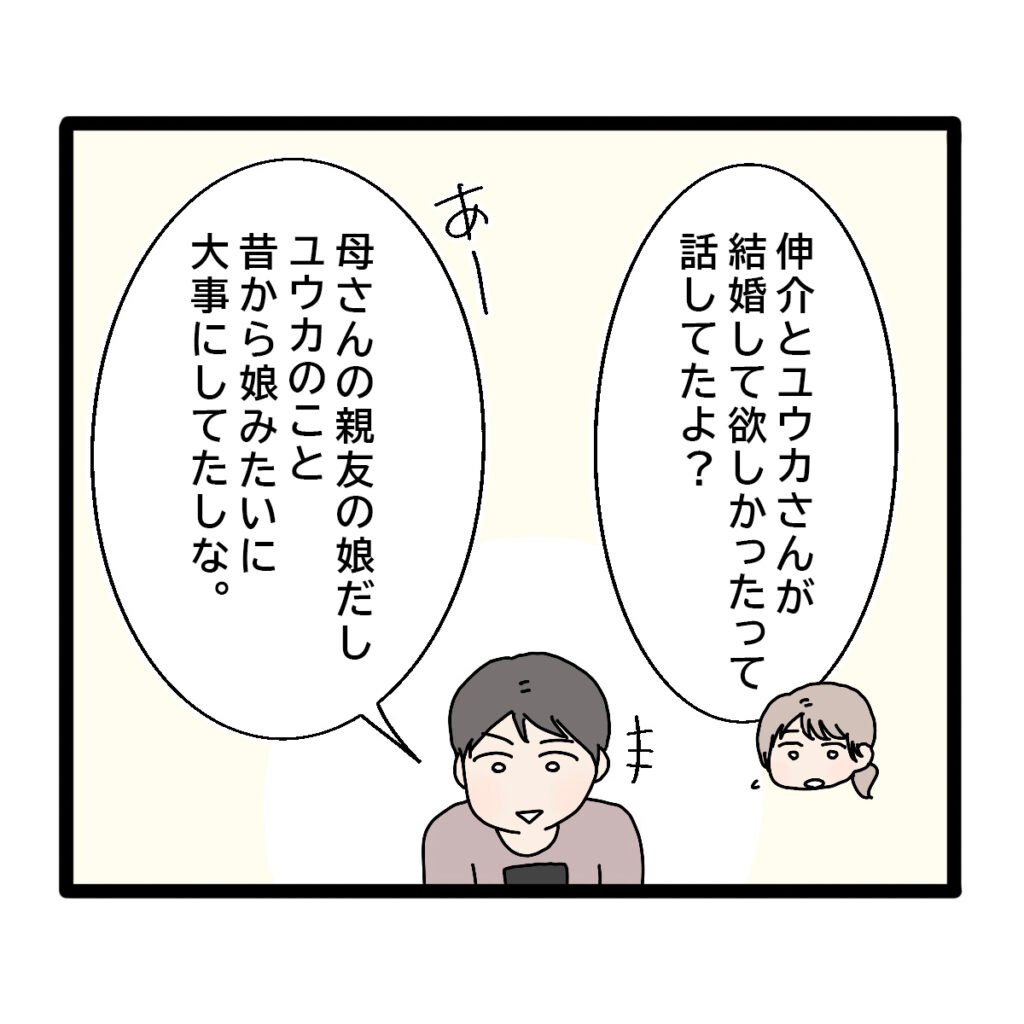 「伸介とユウカさんが結婚して欲しかったって話してたよ?」と言うと、「あー、母さんの親友の娘だし、ユウカのこと昔から娘みたいに大事にしてたしな」とあっさり答える伸介の言葉を聞いて、