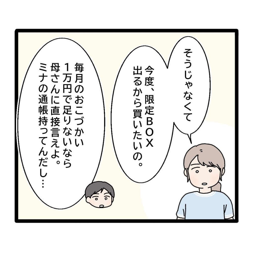 「そうじゃなくて、今度限定BOX出るから買いたいの」と言うと、「毎月のおこづかい、1万円で足りないなら母さんに直接言えよ。ミナの通帳持ってんだし・・」そう伸介に言われて、